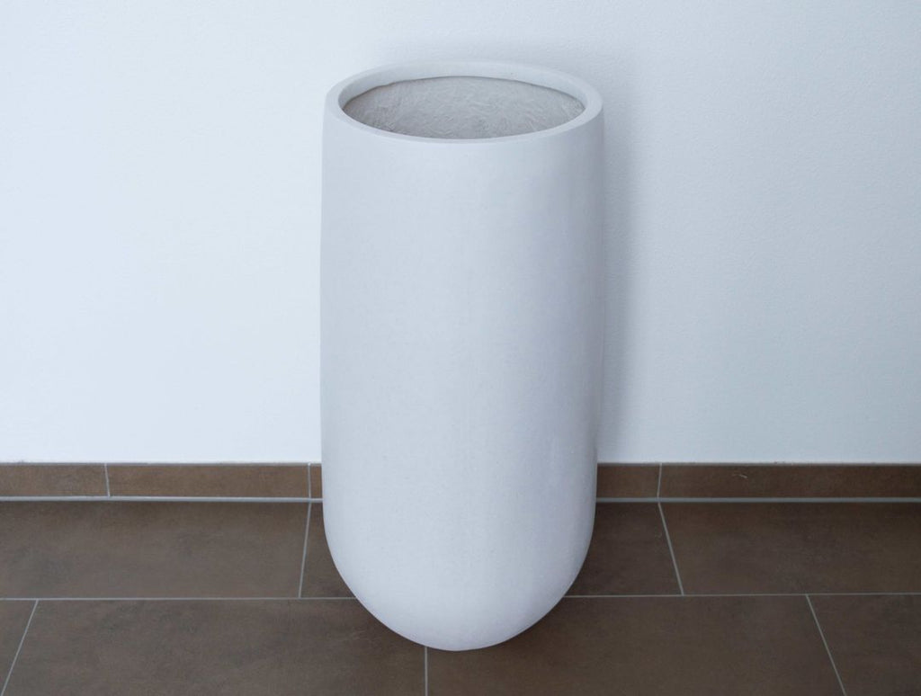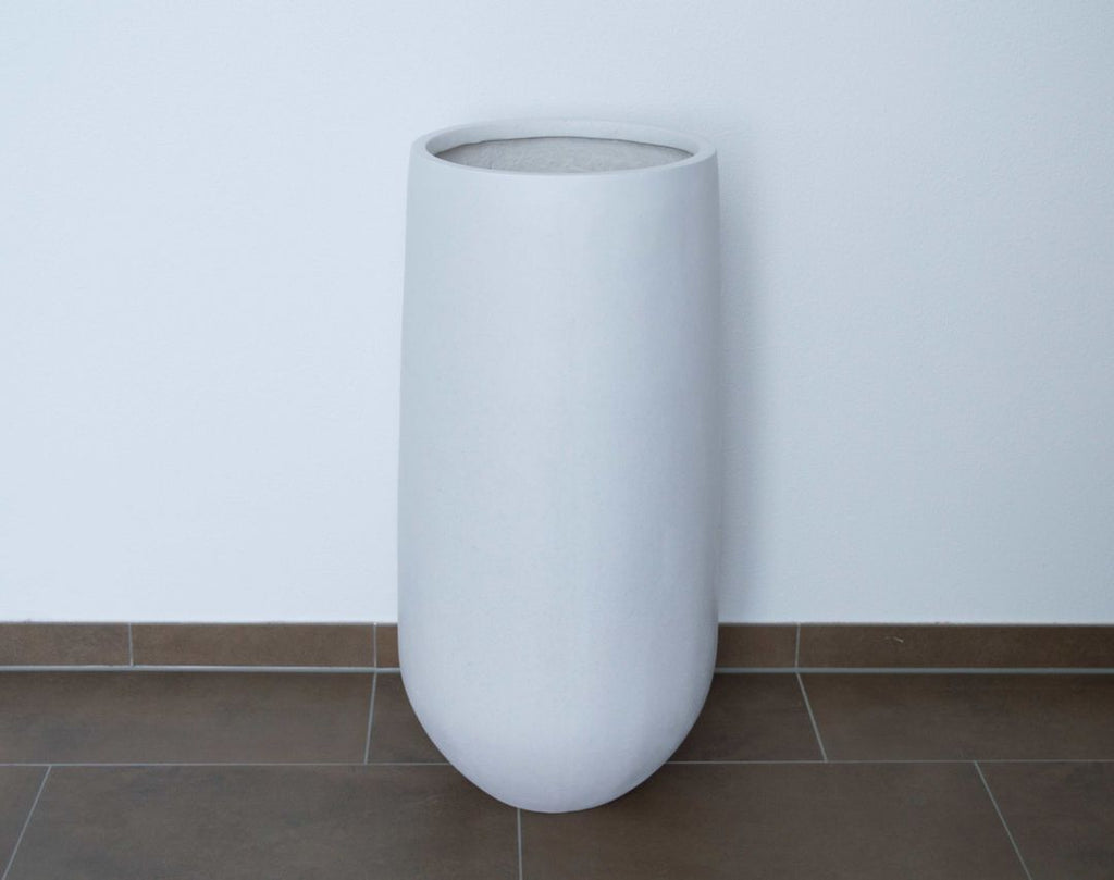 Der rund konische Blumenkübel aus Fiberglas in perlmutt weiß