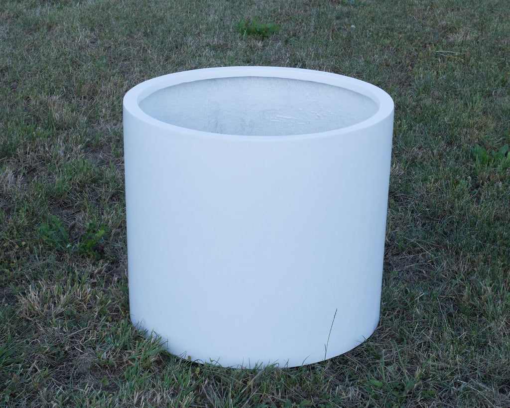 Der zylindrische Blumenkübel aus Fiberglas in perlmutt weiß